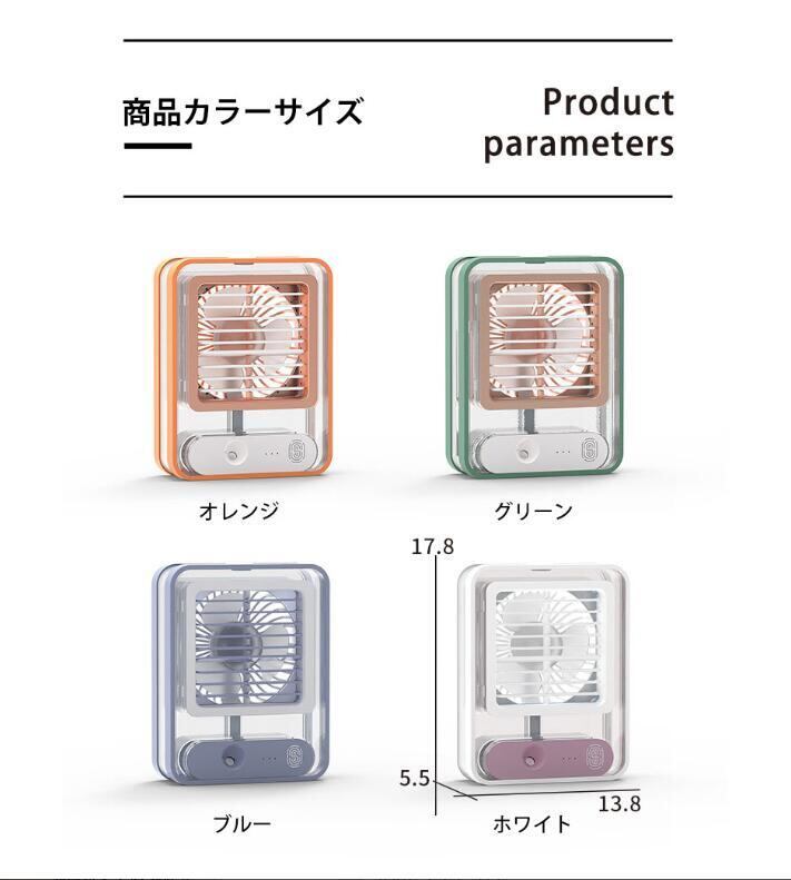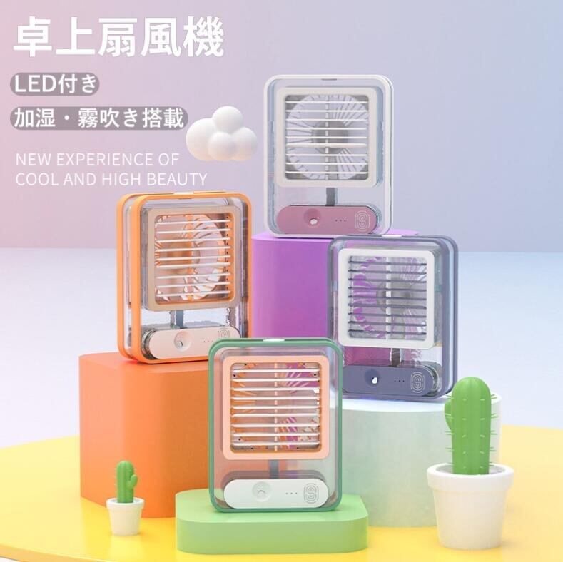 扇風機 ファン クリア 3段階調節 USB 充電式 ミストファン 加湿 LEDライト付き 上下風向き調節